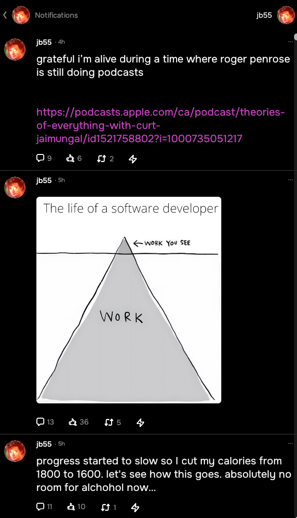 scrolling X on the damus account feels like scrolling linkedin. such a strange feeling when twitter used to be home. Itโs equally strange seeing most of my IRL bitcoiner friends still on there. Most bitcoin core devs post there, even though there is a libsecp256k1-secured network right here with mostly bitcoiners!? Network effects are *immense*. hats off to the people who took the leap regardless and are still here. Yaโll are the real ones.