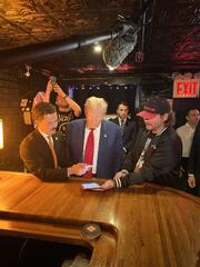 President Donald Trump buying burgers at nostr:npub1key55ax33gkl50uqemvl4khrtqrhzm7wzpc7fhseutt5ddkcwcrqgxlt3h with nostr:npub1xy6exlg37pw84cpyj05c2pdgv86hr25cxn0g7aa8g8a6v97mhduqeuhgpl.