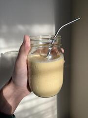 2 bananas, 2 dates, 2 egg yolks, raw milk, pinch of sea salt, local honey and blend