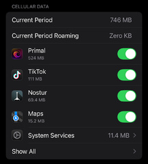I reset my mobile data stats and then used Primal for about 20 minutes, TikTok for about the same, and Nostur for about 10 minutes, and this is what the data usage looks like for each. Oof π