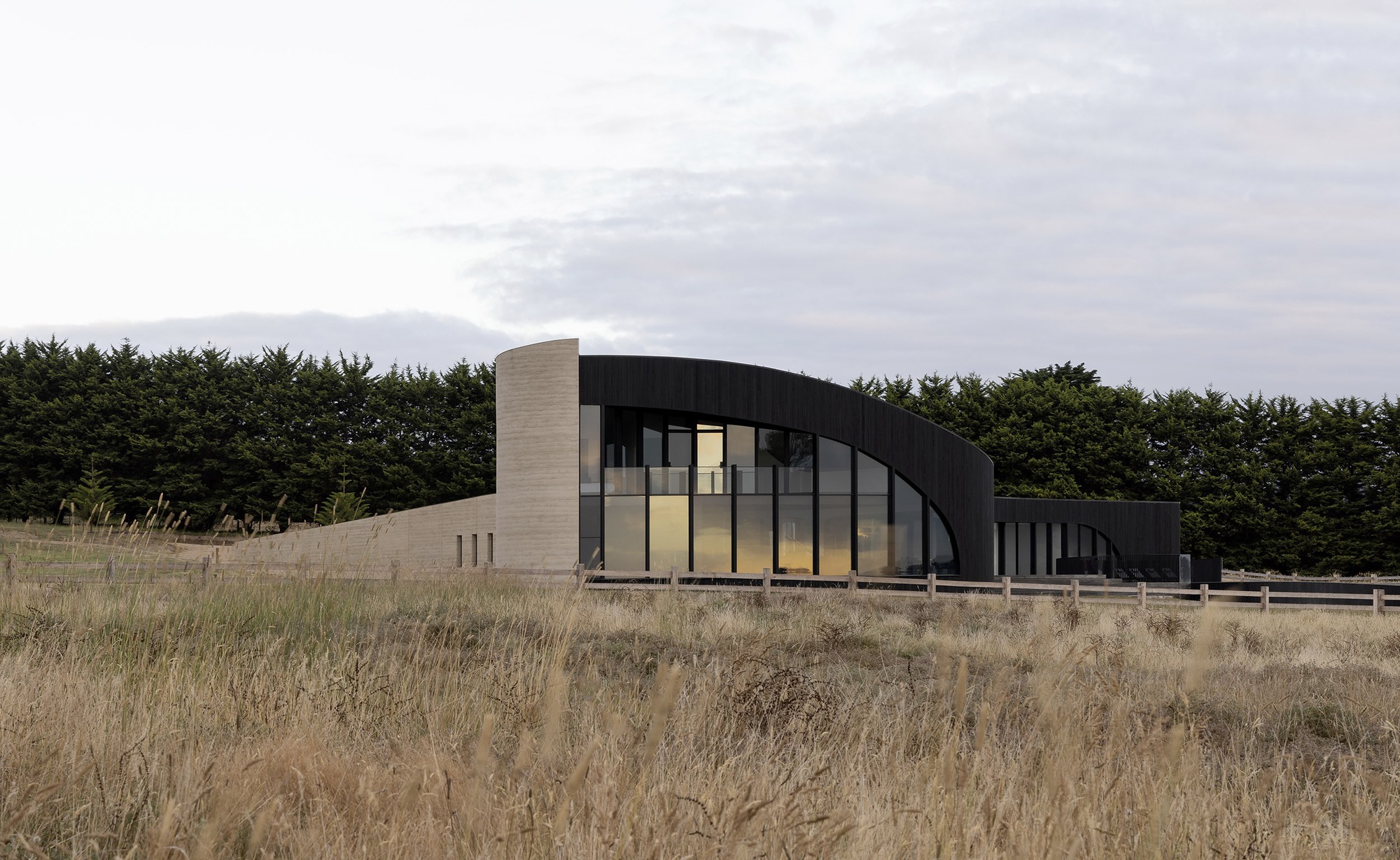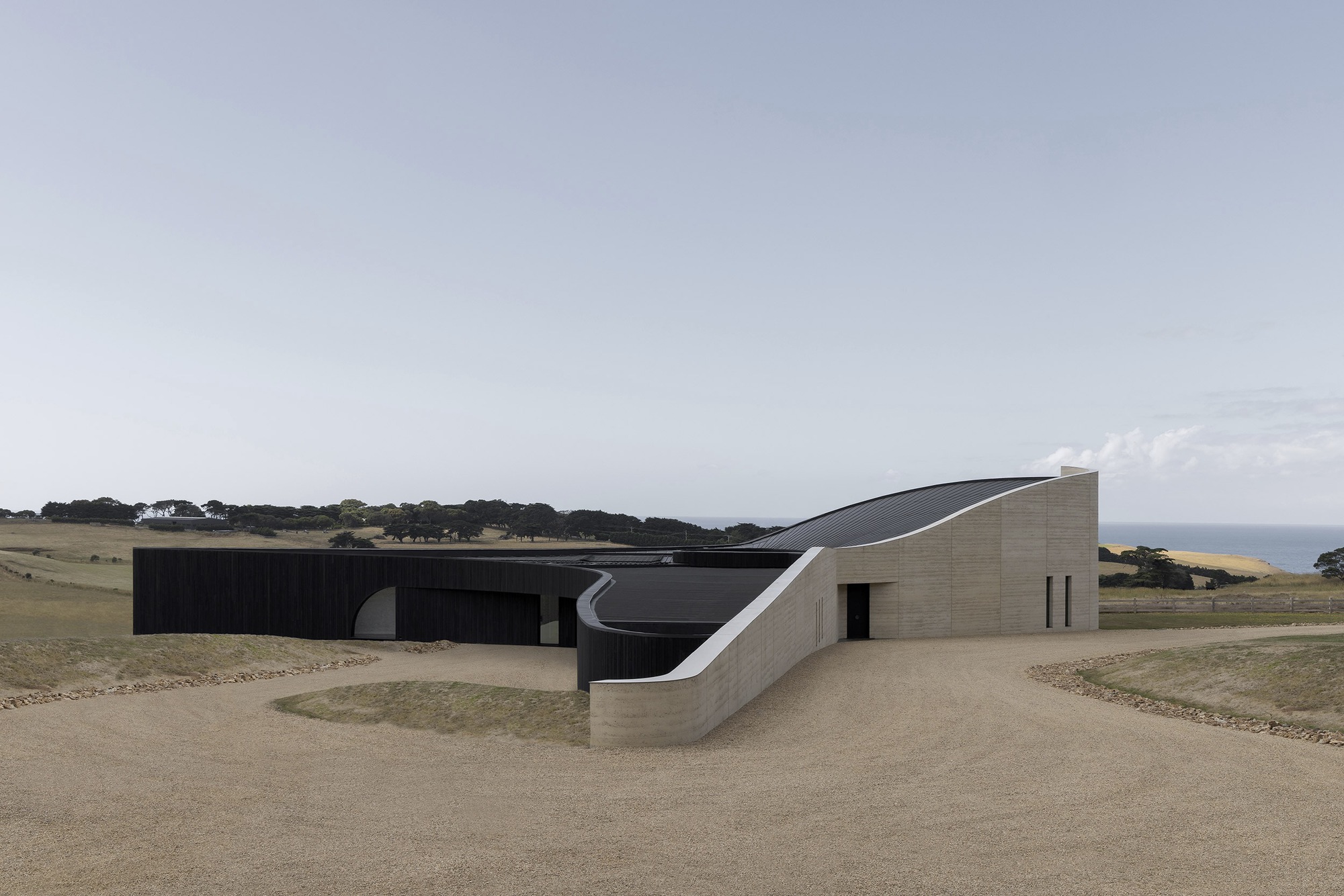 As an artistic architectural response to Australia’s coastline and the contours of the rural landscape, Peninsula House forms a dramatic sculptural relic, weathered by its context. The dwelling is located on the high point of the site, overlooking a coastal stretch of Flinders with Bass Strait beyond. Approached along a meandering driveway, a ribbon of rammed earth rises monumentally 10 meters into the air, wrapping behind the dwelling before gradually tapering and returning to the landscape. The elevation has minimal glazing and considerable thermal mass – stabilizing the heat from the afternoon sun. A notch midway along the wall forms a shadow line, subtly defining the entry.