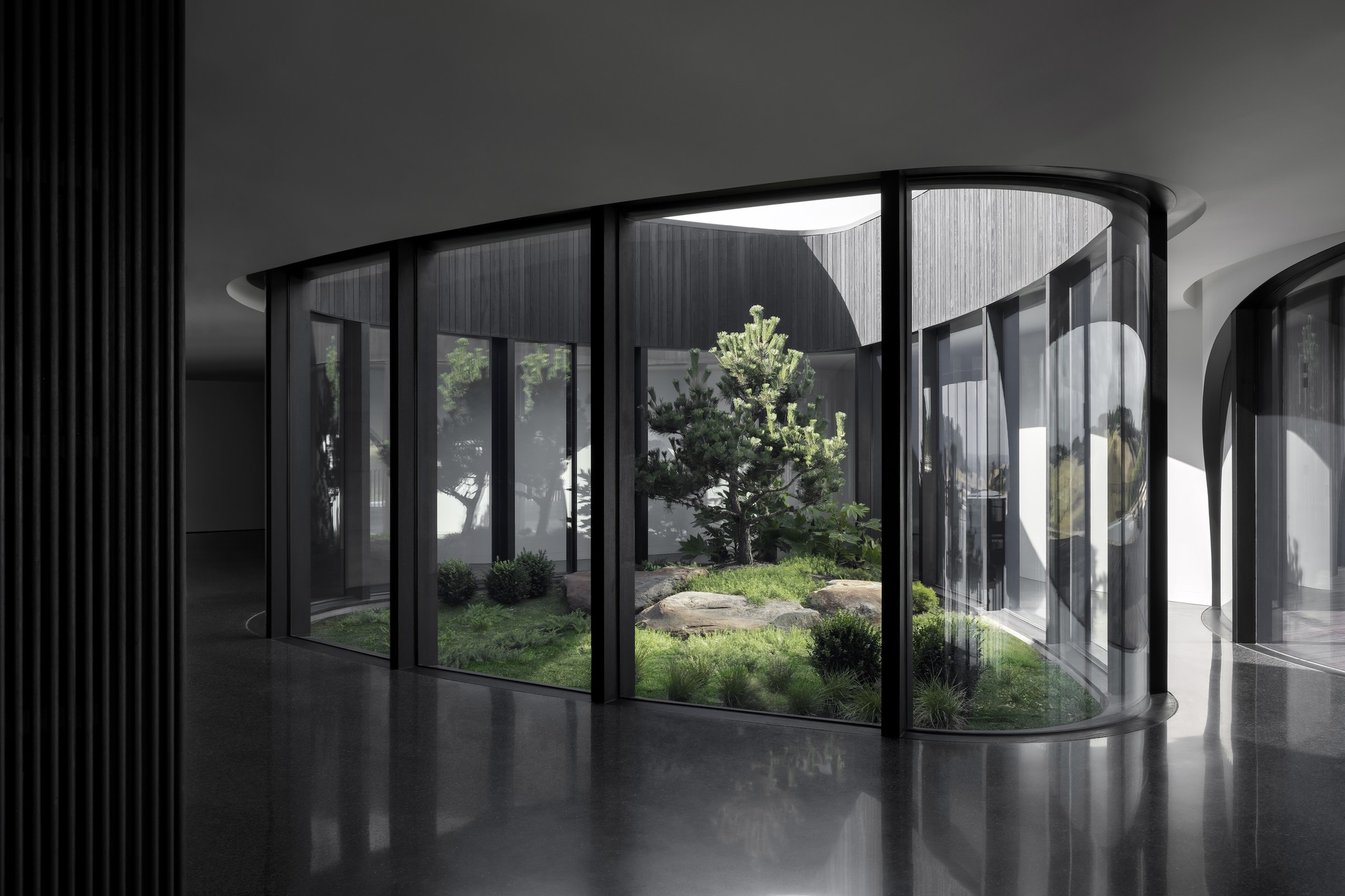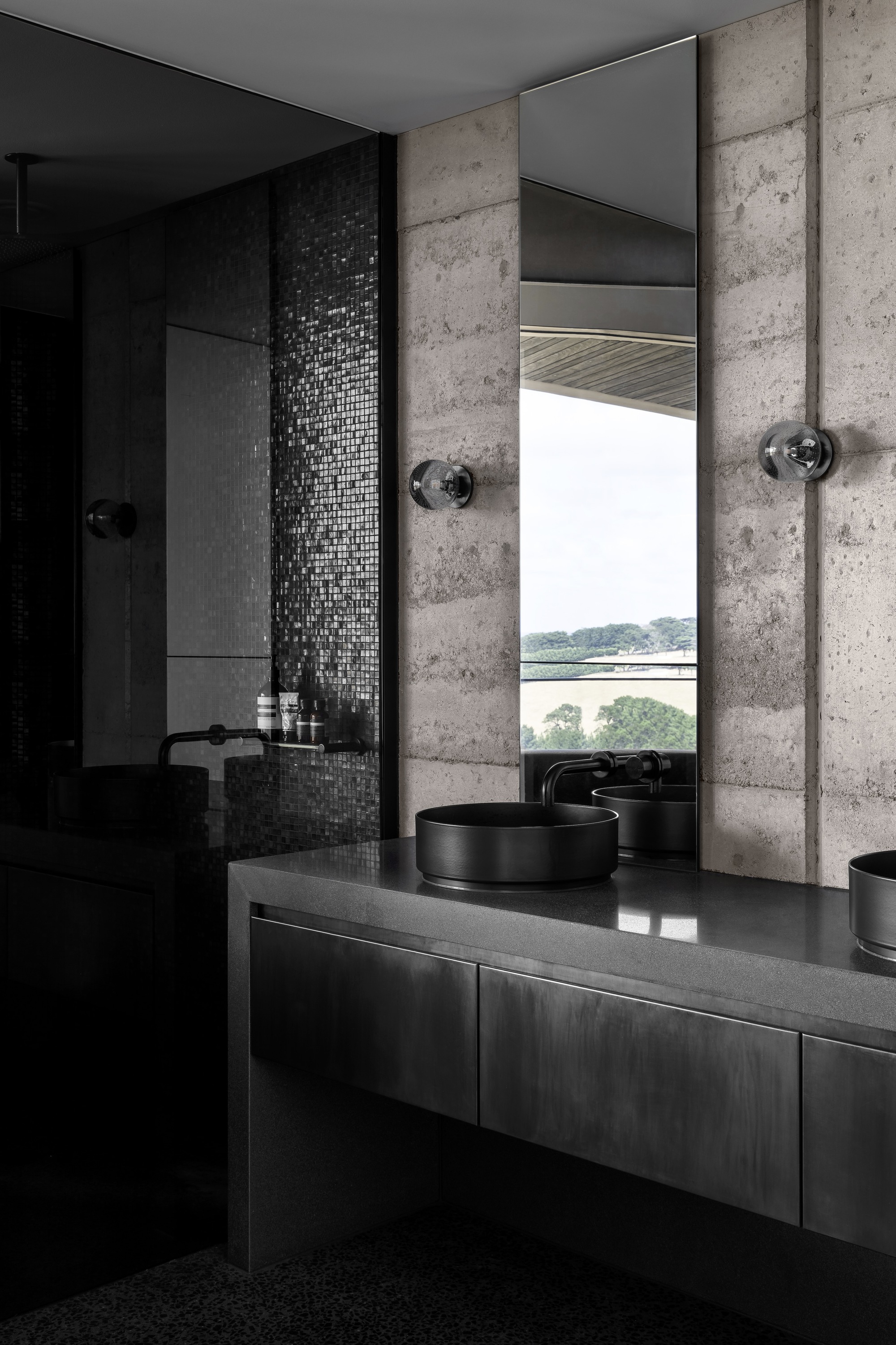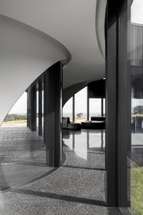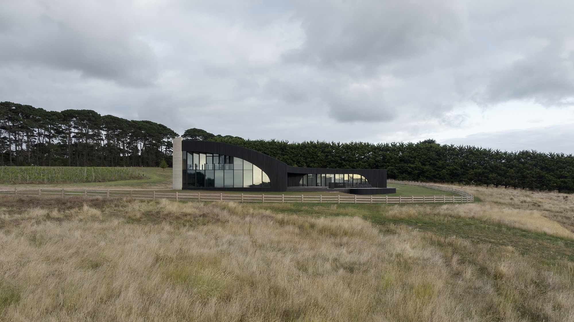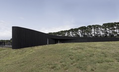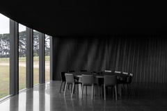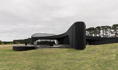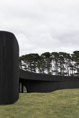 The dark, natural external material palette of charred timber and rammed earth shrouds the building, selected for its robust and low-maintenance qualities. The charred battens cloak the building mass, allowing it to recede into the rural context as an enigmatic form. Internally, the thematic quality of darkness continues with black mosaic tiles, black timber battens, blackened brass, and black terrazzo flooring. There is an emphasis on the shifting nature of light and shadow along curving surfaces and forms of walls and openings. The monochromatic tones frame views of the natural colors present in the surrounding setting.