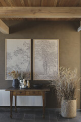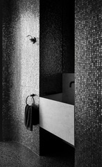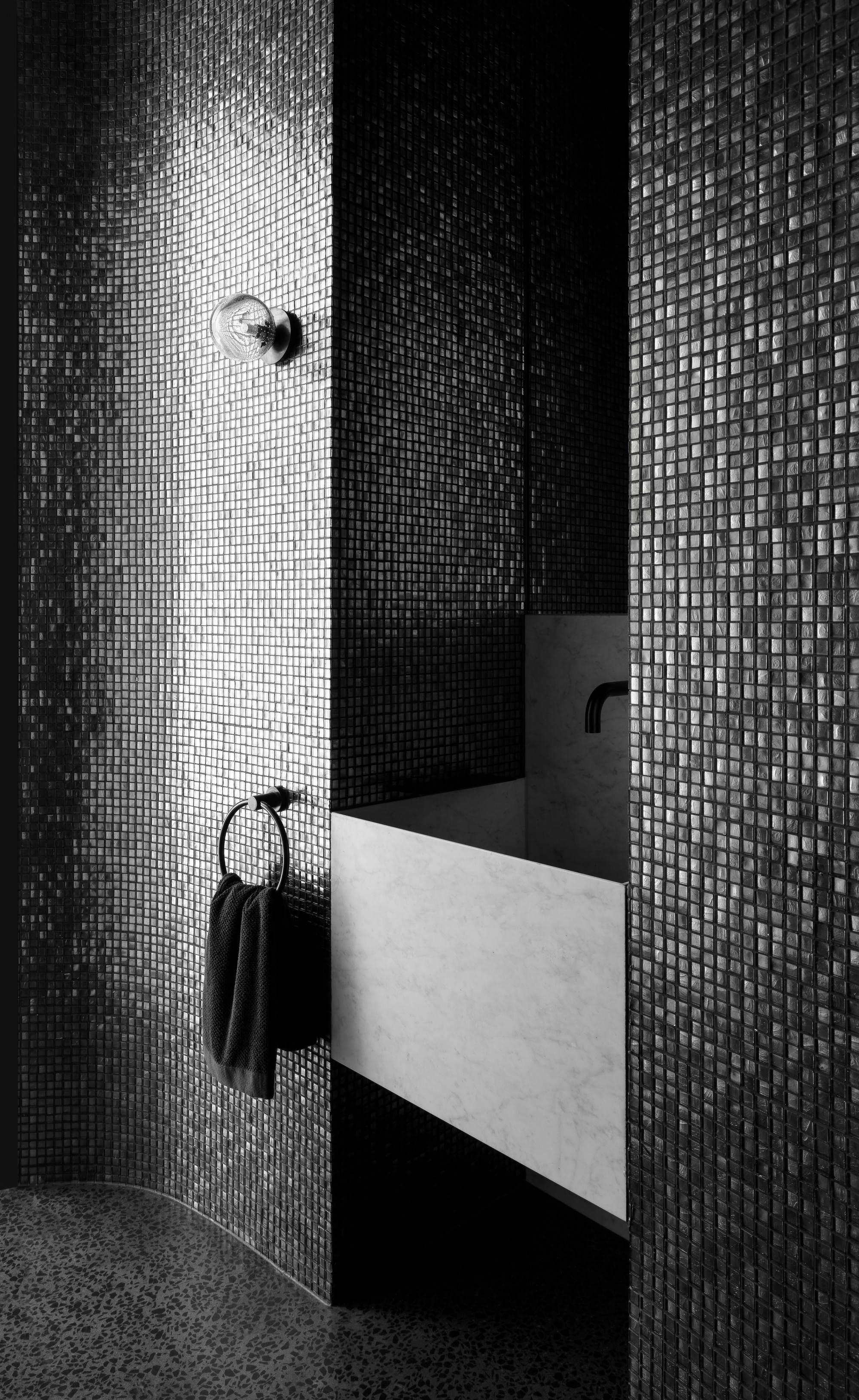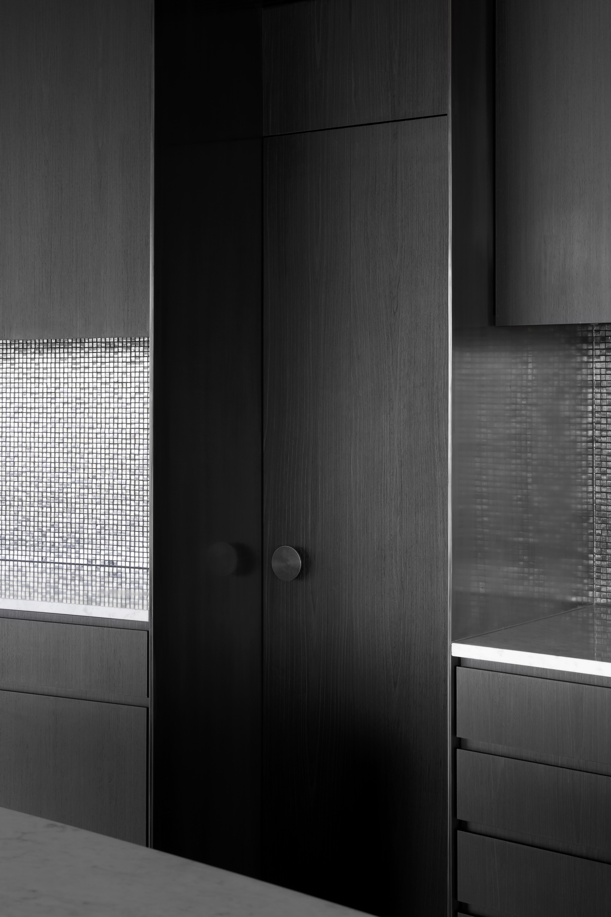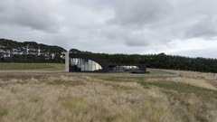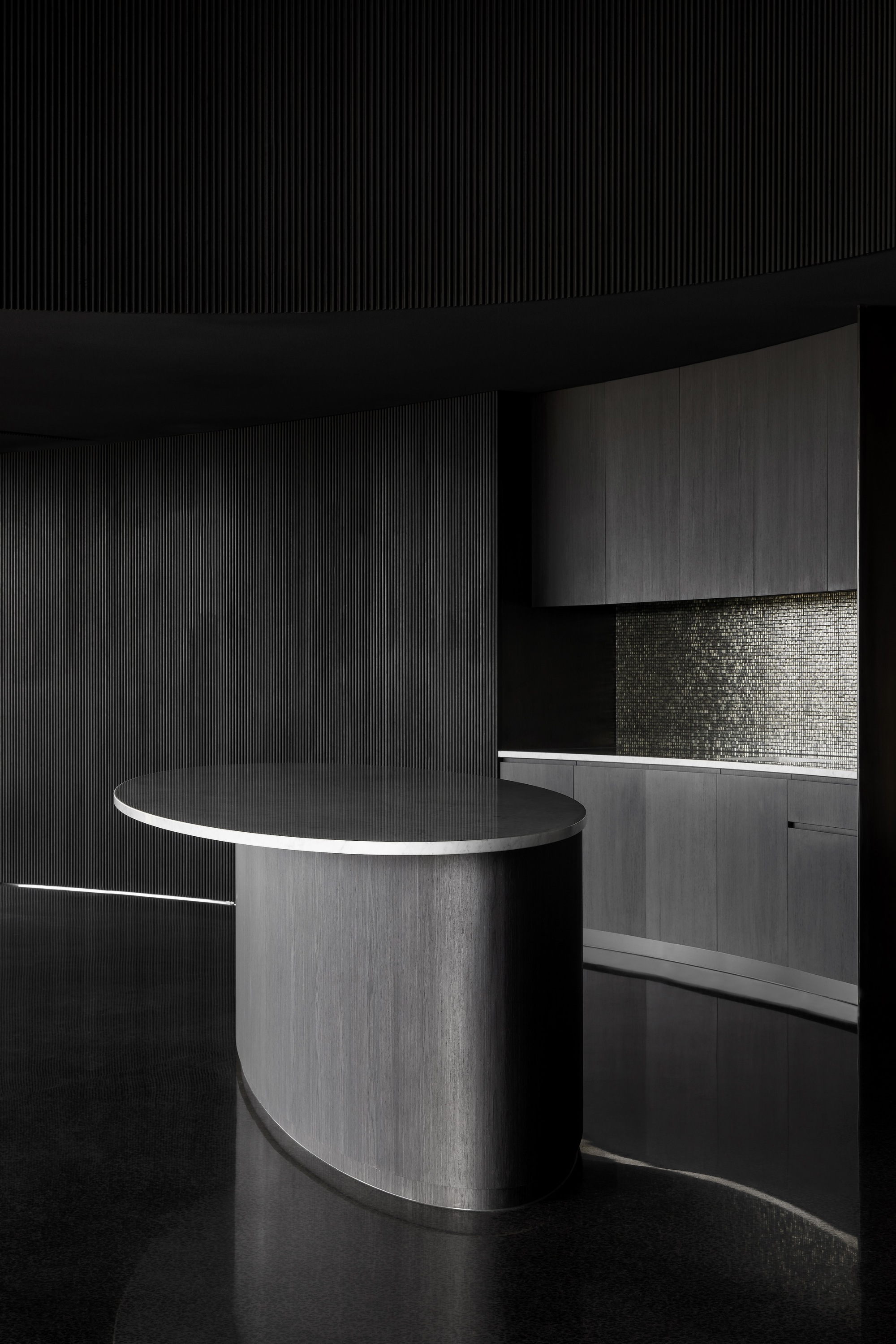 The dark, natural external material palette of charred timber and rammed earth shrouds the building, selected for its robust and low-maintenance qualities. The charred battens cloak the building mass, allowing it to recede into the rural context as an enigmatic form. Internally, the thematic quality of darkness continues with black mosaic tiles, black timber battens, blackened brass, and black terrazzo flooring. There is an emphasis on the shifting nature of light and shadow along curving surfaces and forms of walls and openings. The monochromatic tones frame views of the natural colors present in the surrounding setting.