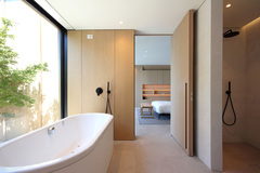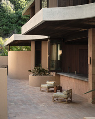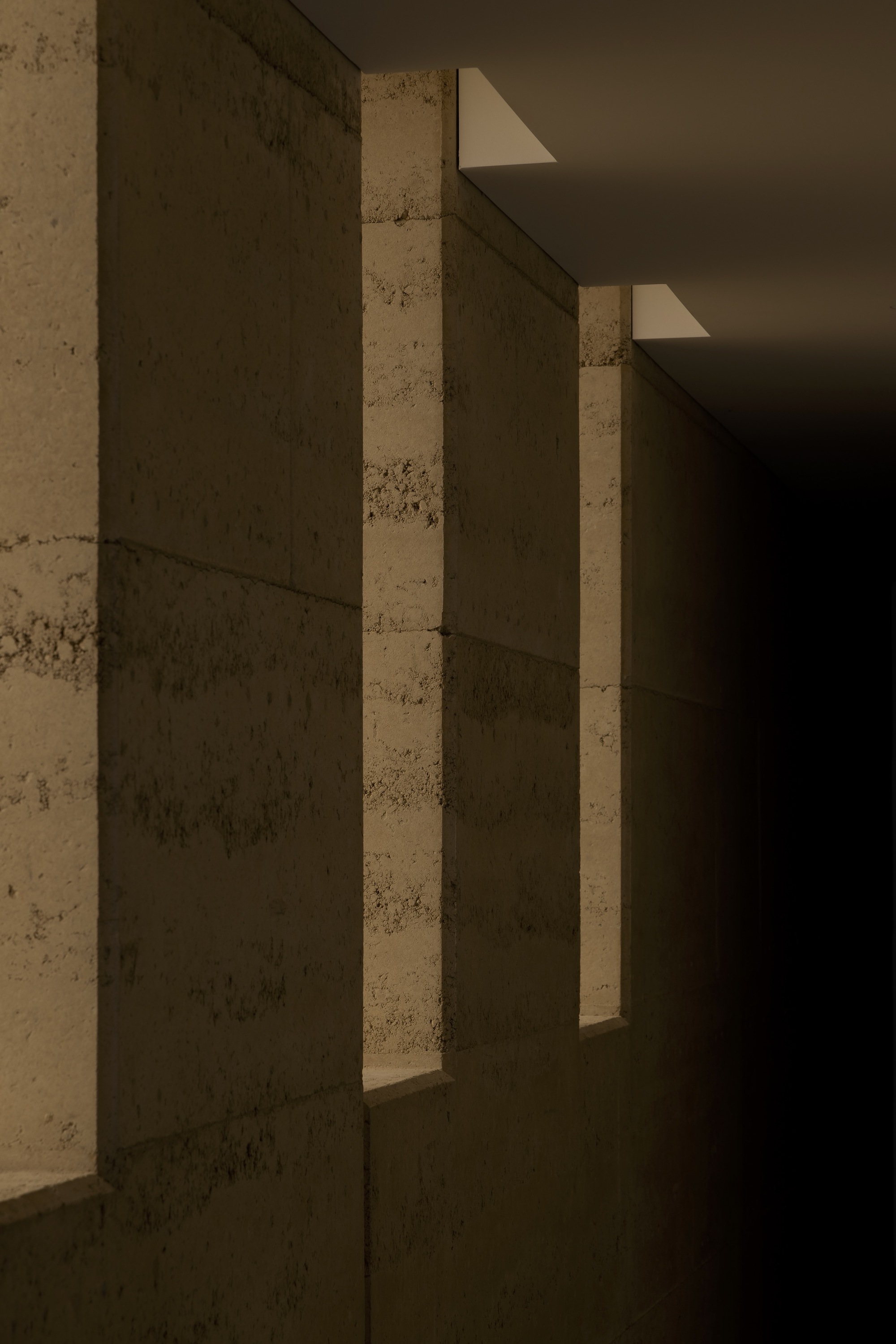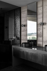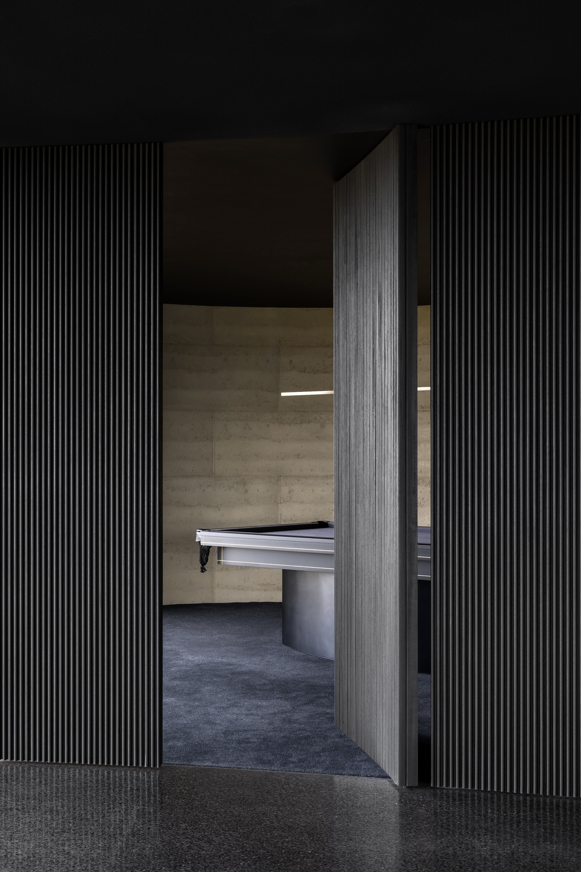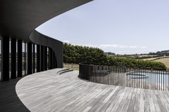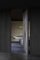 Adjacent to the main living space is a large, sheltered terrace fulfilling the client’s brief to host grand poolside events with views of the valley and water. Each of the five bedrooms and main living spaces celebrates views of the rural context and surrounds. At the end of an evocative hallway, lined on one side with rammed earth and slot windows, lies a purpose-built recording studio.