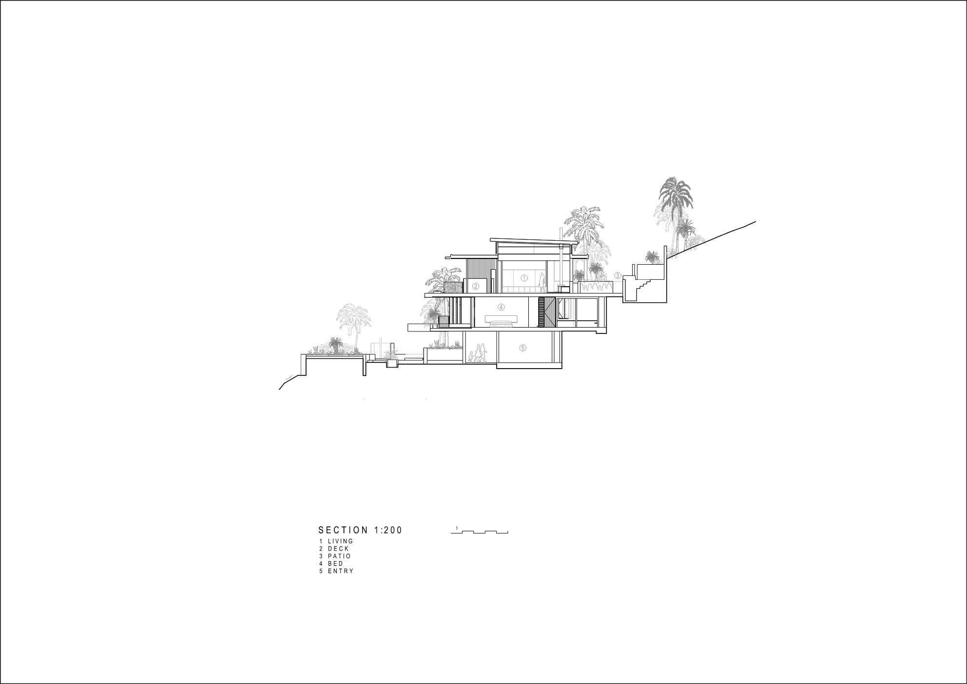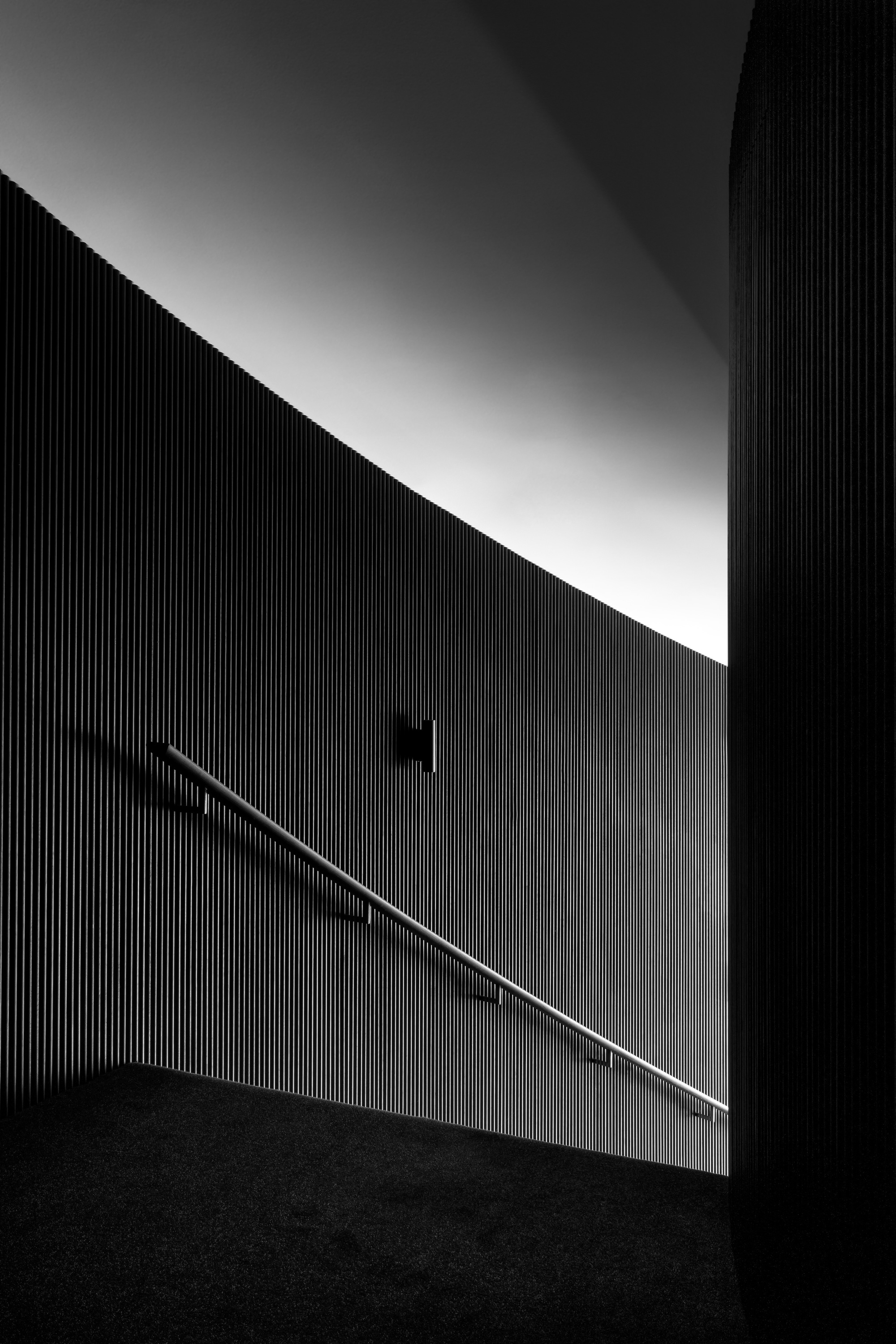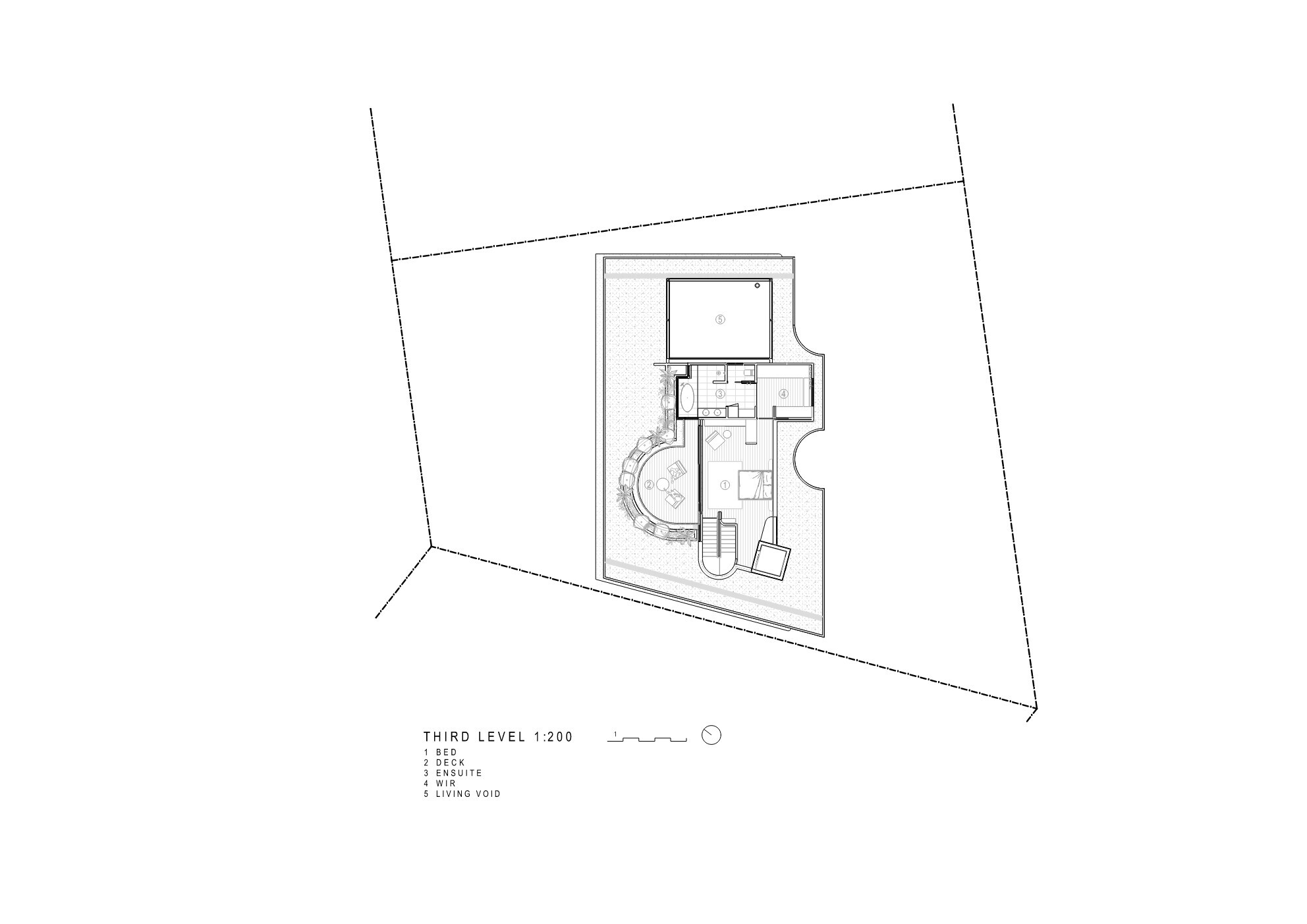 Crossing the entry threshold, a lush, planted atrium defines the building’s axial center and allows natural light to flood into the interior. Bending hallways snake from the atrium to create three distinct zones – a living zone for entertaining, a bedroom zone, and a recreation zone. The private master bedroom sits above the living zone, accessed by a sweeping stair cloaked in darkness. The main double-height living space dramatically rises towards the glazing and expansive views of the rural terrain and ocean. The sweeping parabolic ceiling affords a unique acoustic quality to the space that accommodates the sound from the owner’s grand piano and collection of musical instruments.