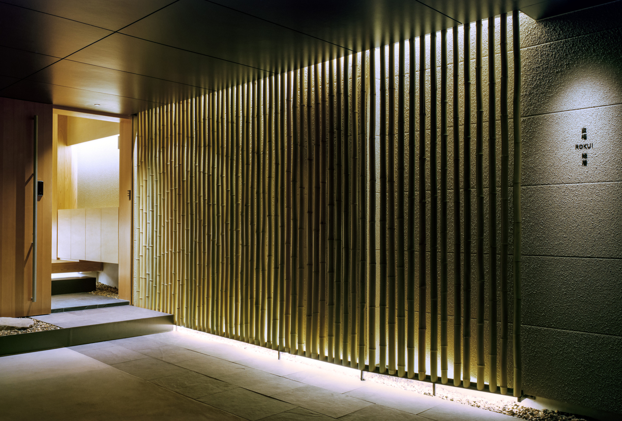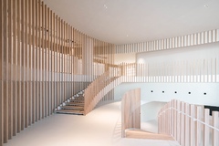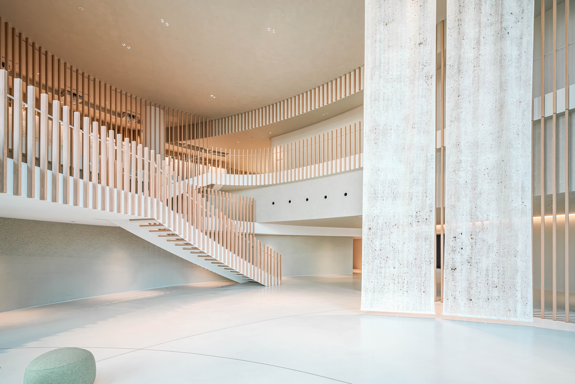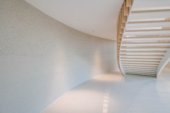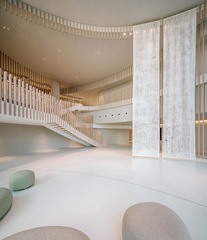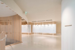 The entrance hall retains the memories of the sloping terrain woodland that once existed at the site, creating a heartwarming space that invites visitors to walk up an easy slope. The tapestries designed to mimic rain falling on trees were created, in collaboration with a craftsman specializing in Japanese paper (Ogawa washi) making, a traditional craft of a neighboring town, by using 2.5 m × 8.0 m pieces of washi. The plaster walls produced by the artistic plasterer Naoki Kusumi also add color to the entrance hall.