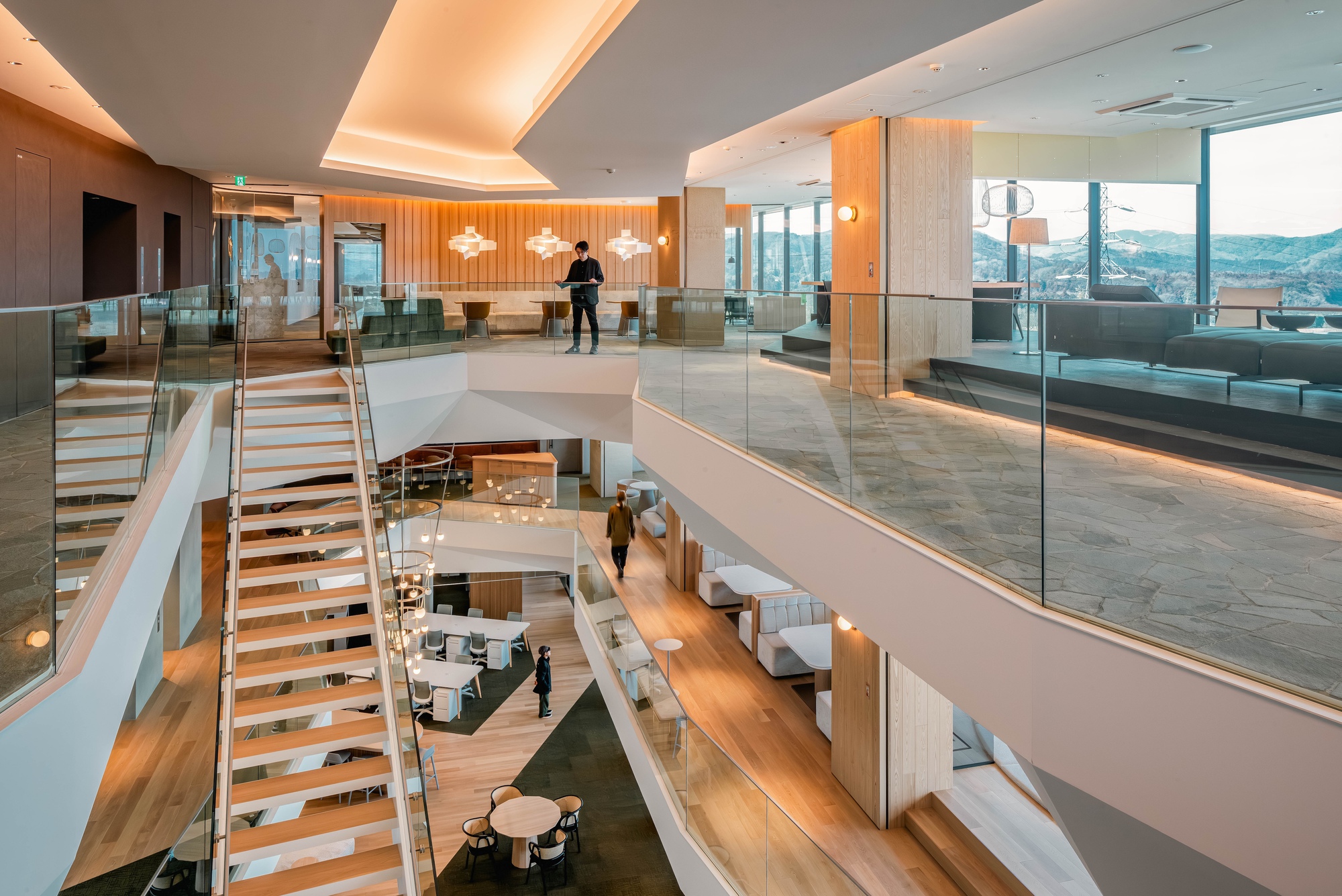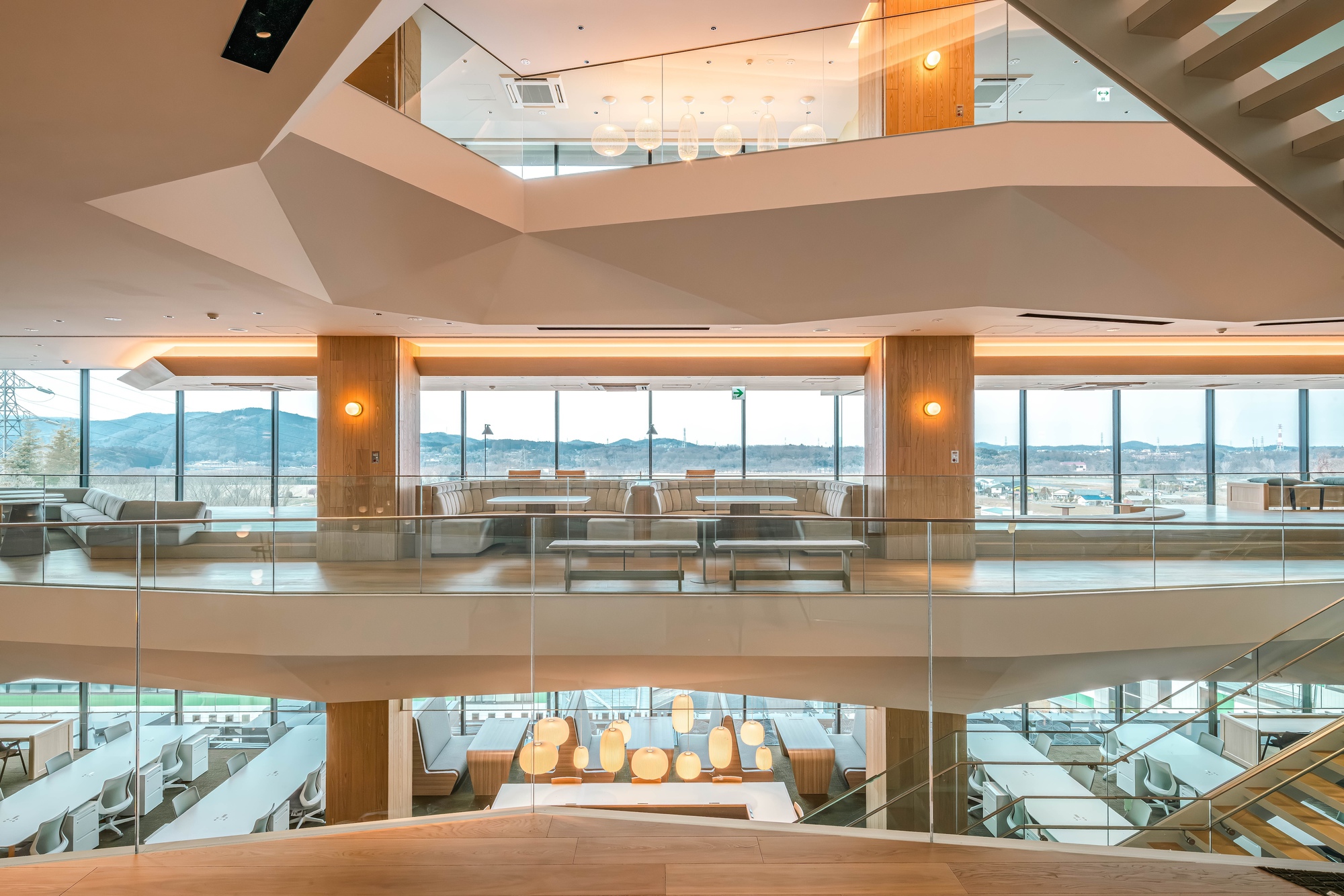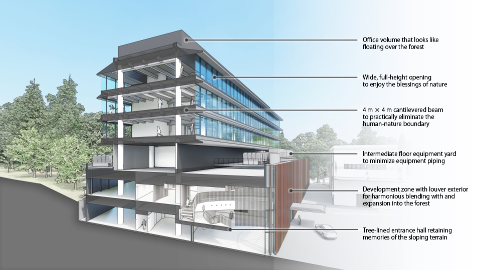 The multi-floor open space interconnecting the three office floors was inspired by the panoramic ridge lines of the Chichibu Mountains and the landscapes of the Ranzan Ravine. The irregularly shaped multi-floor open space creates places of various configurations, just as a ravine offers places of varied shapes so that anglers and campers can find places of their liking. Varied spaces and places laid out around the multi-floor open space are interconnected by stairs and circulation lines so as to create opportunities for unexpected exchanges. The four-meter-wide cantilevered peripheral zone of each floor forms a daringly wide, open space that practically connects the internal space and the surrounding environment.