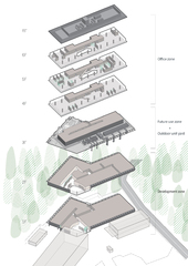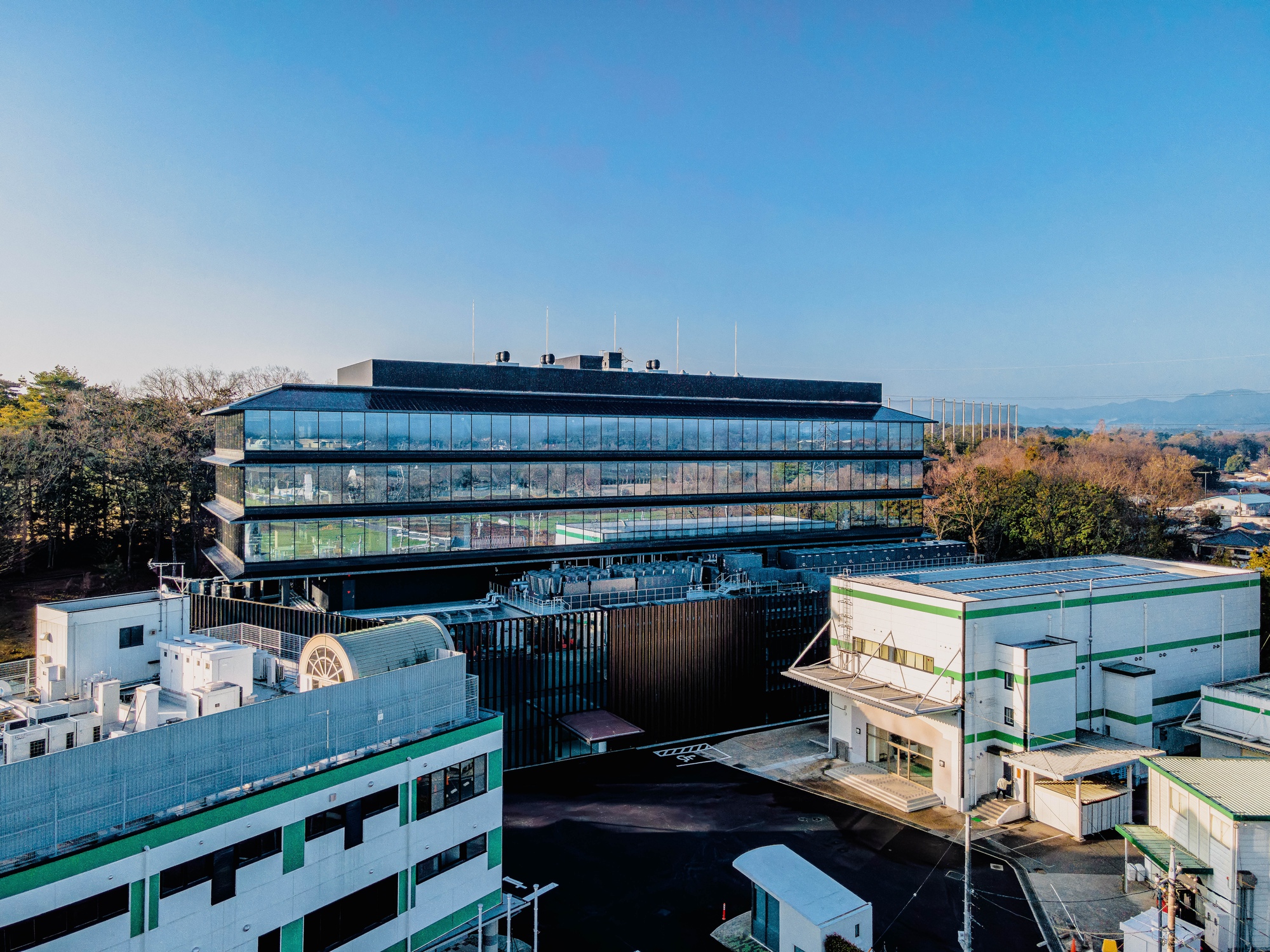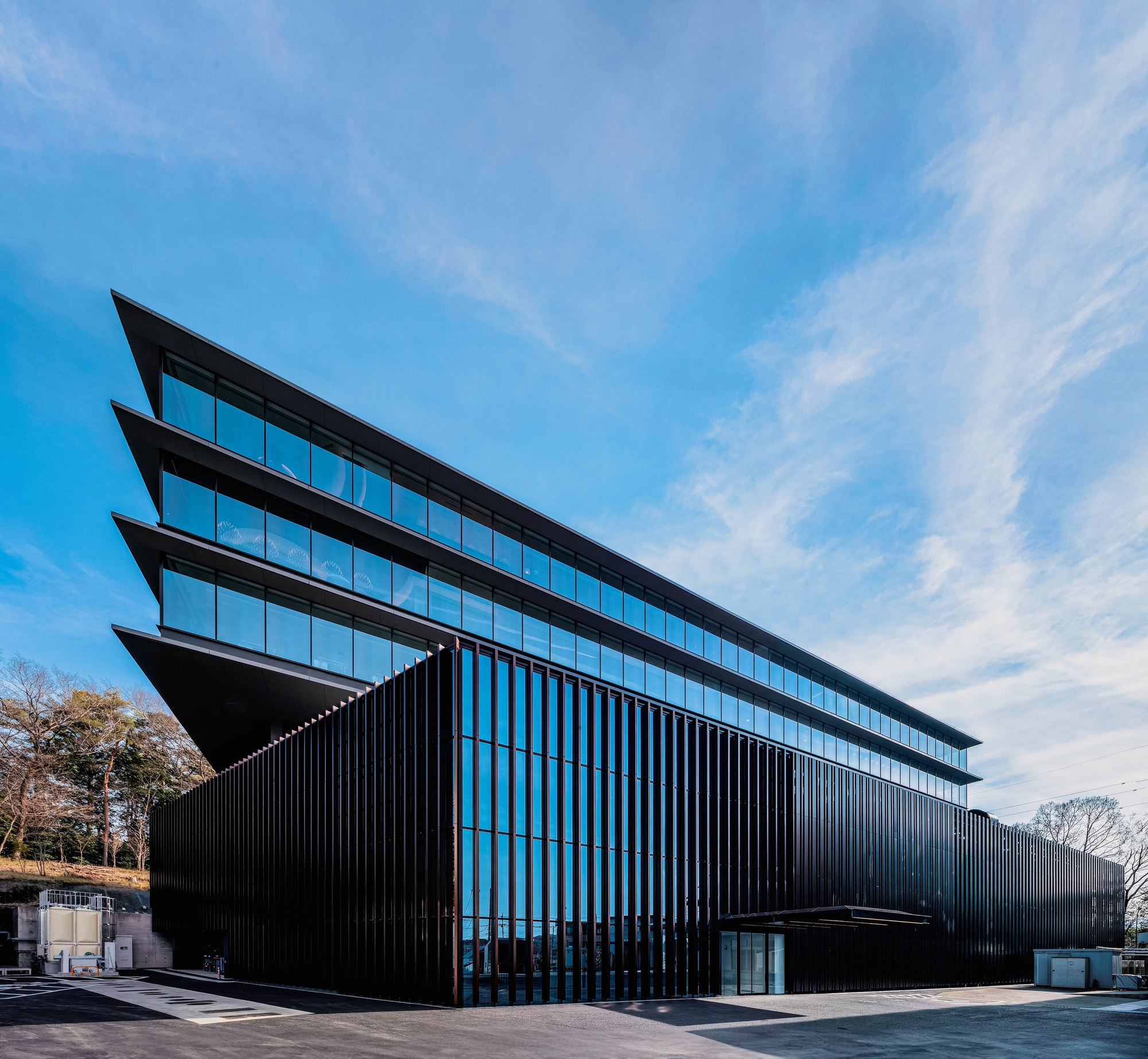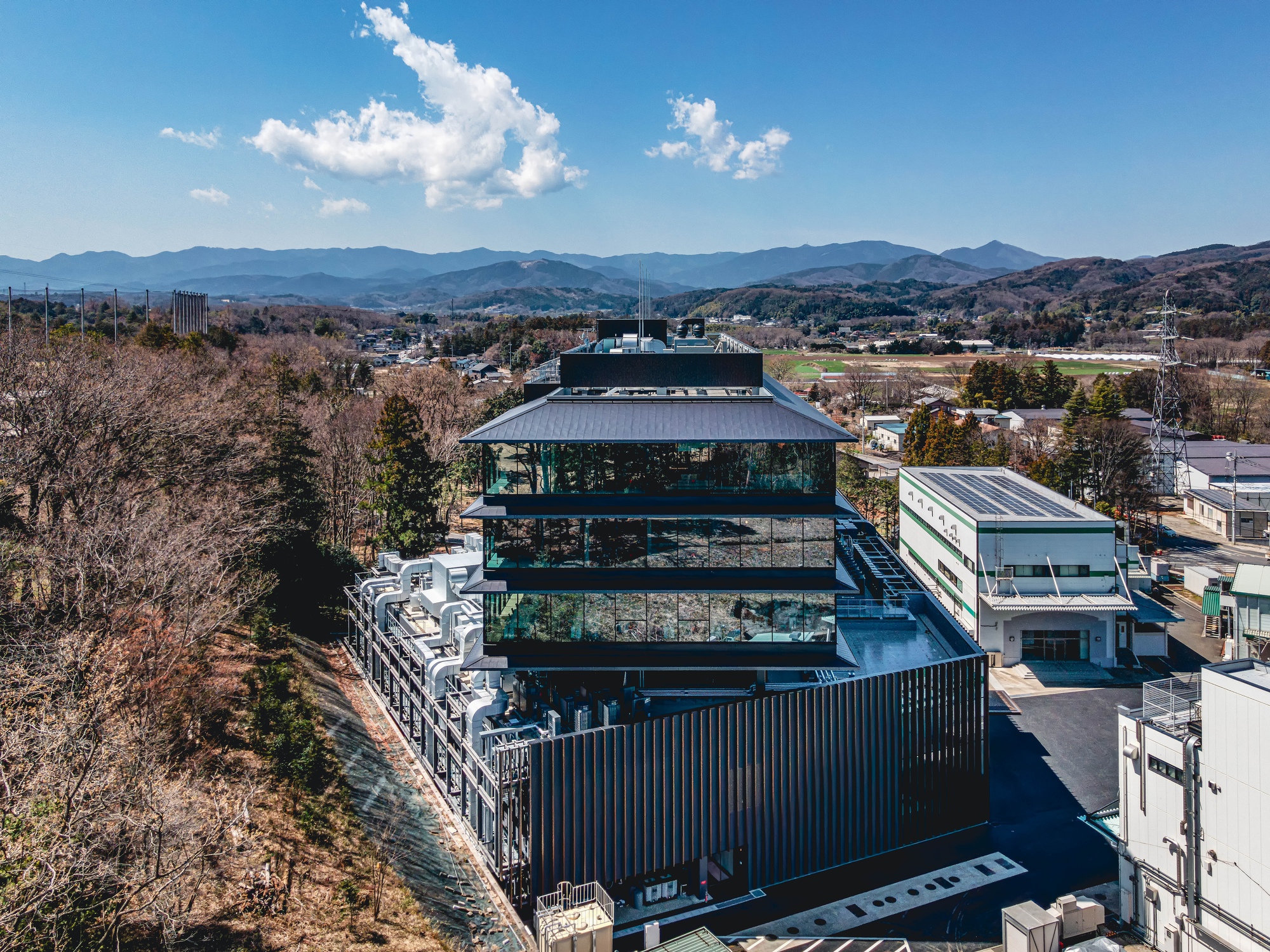 The building thus created consists of the lower floors to be used as a development zone, the intermediate floors containing machinery and equipment for the lower floors and extra space for future use and the upper floors designed as an office zone with bird's-eye views of surrounding natural landscapes. By stacking functionally optimized, purpose-specific planes, a dynamic space with a rich variety of indoor and outdoor space has been created.