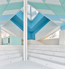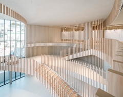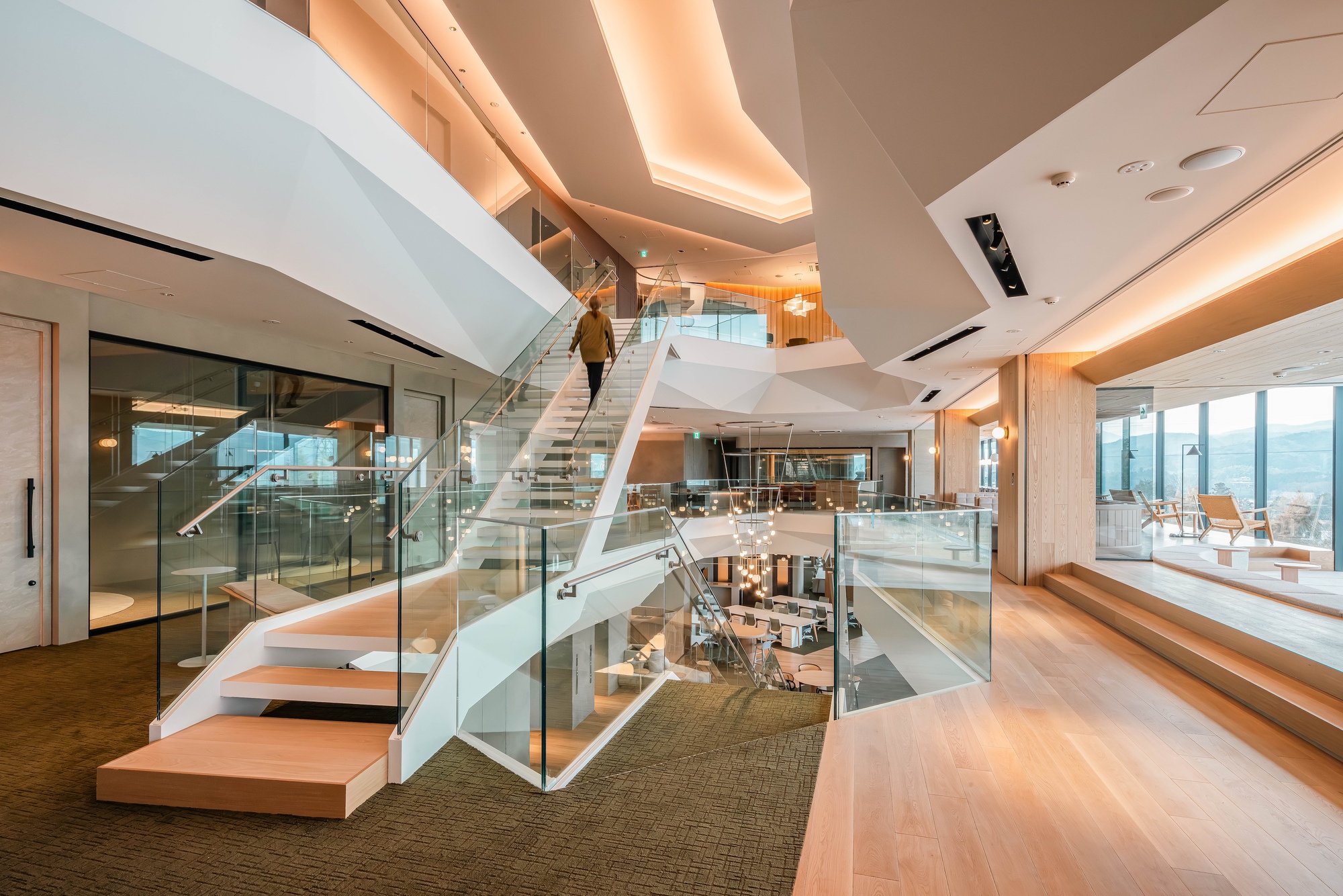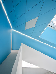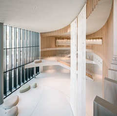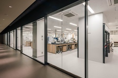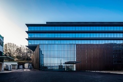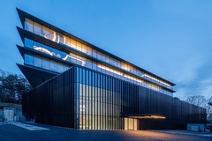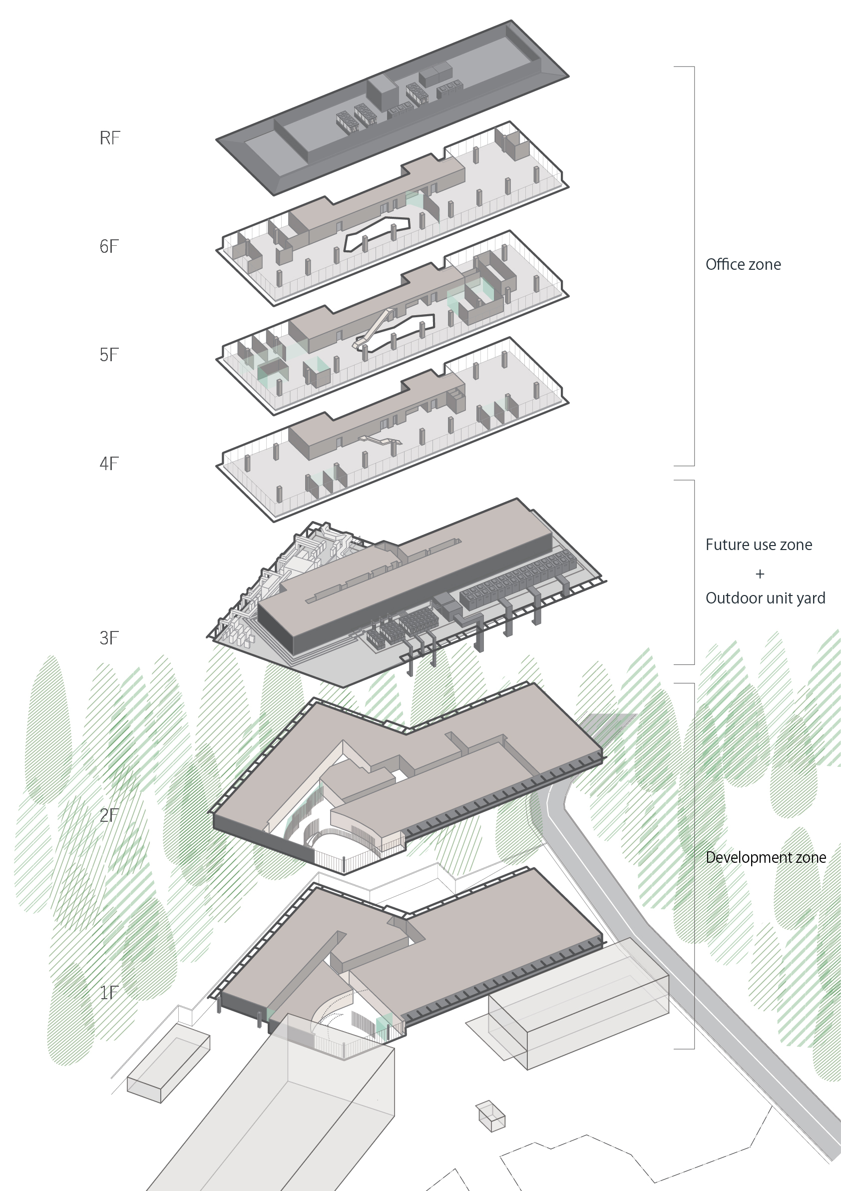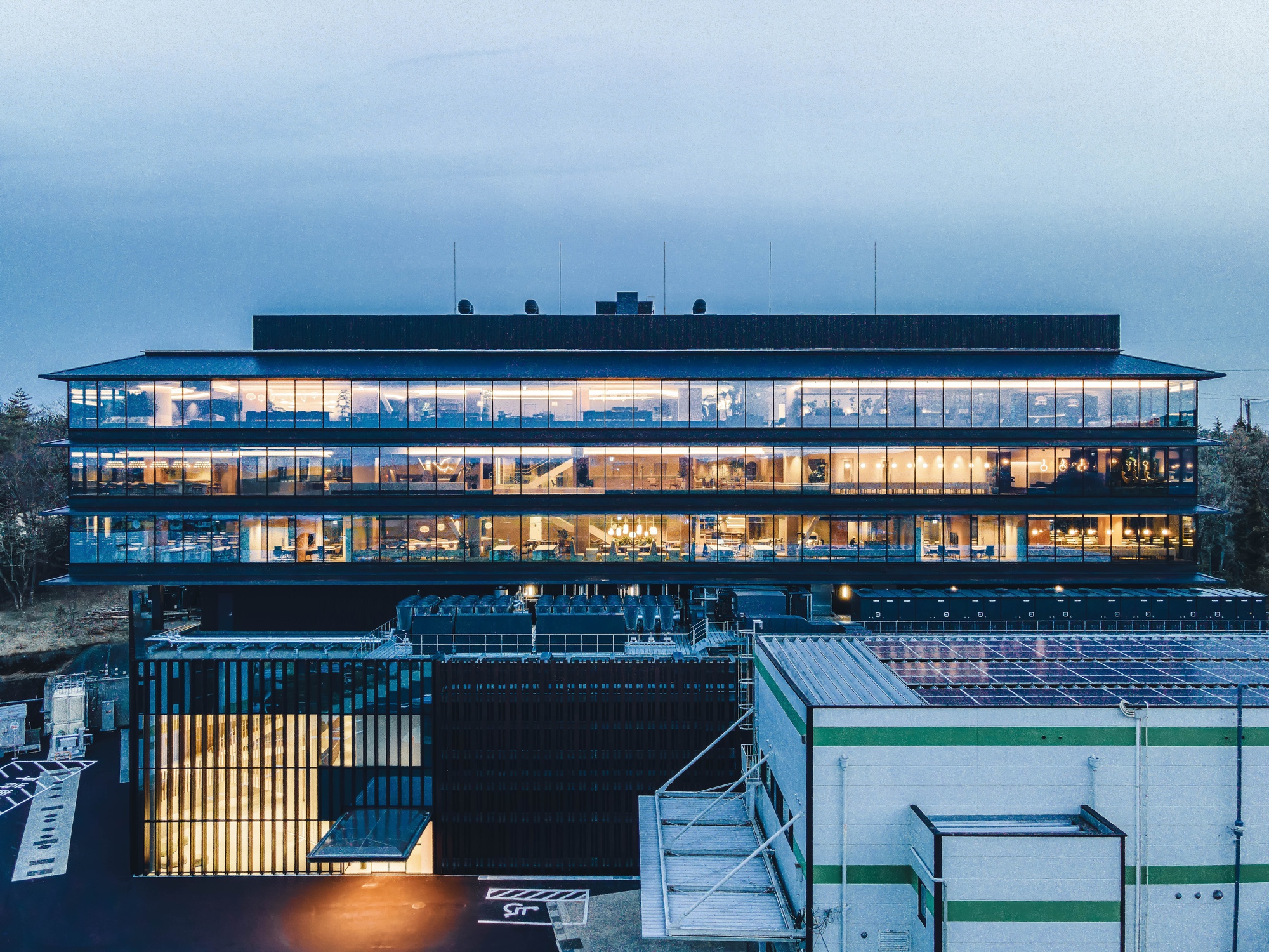 The building thus created consists of the lower floors to be used as a development zone, the intermediate floors containing machinery and equipment for the lower floors and extra space for future use and the upper floors designed as an office zone with bird's-eye views of surrounding natural landscapes. By stacking functionally optimized, purpose-specific planes, a dynamic space with a rich variety of indoor and outdoor space has been created.
