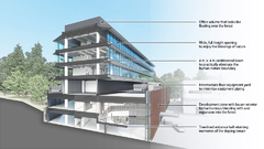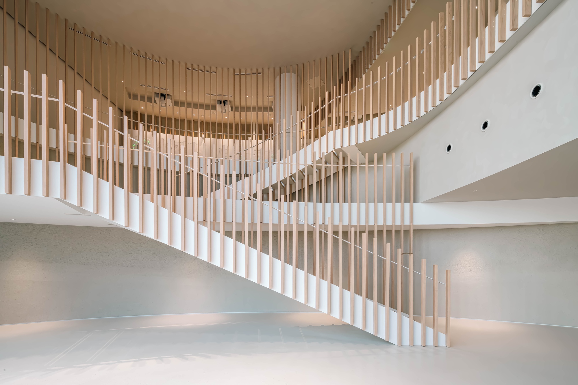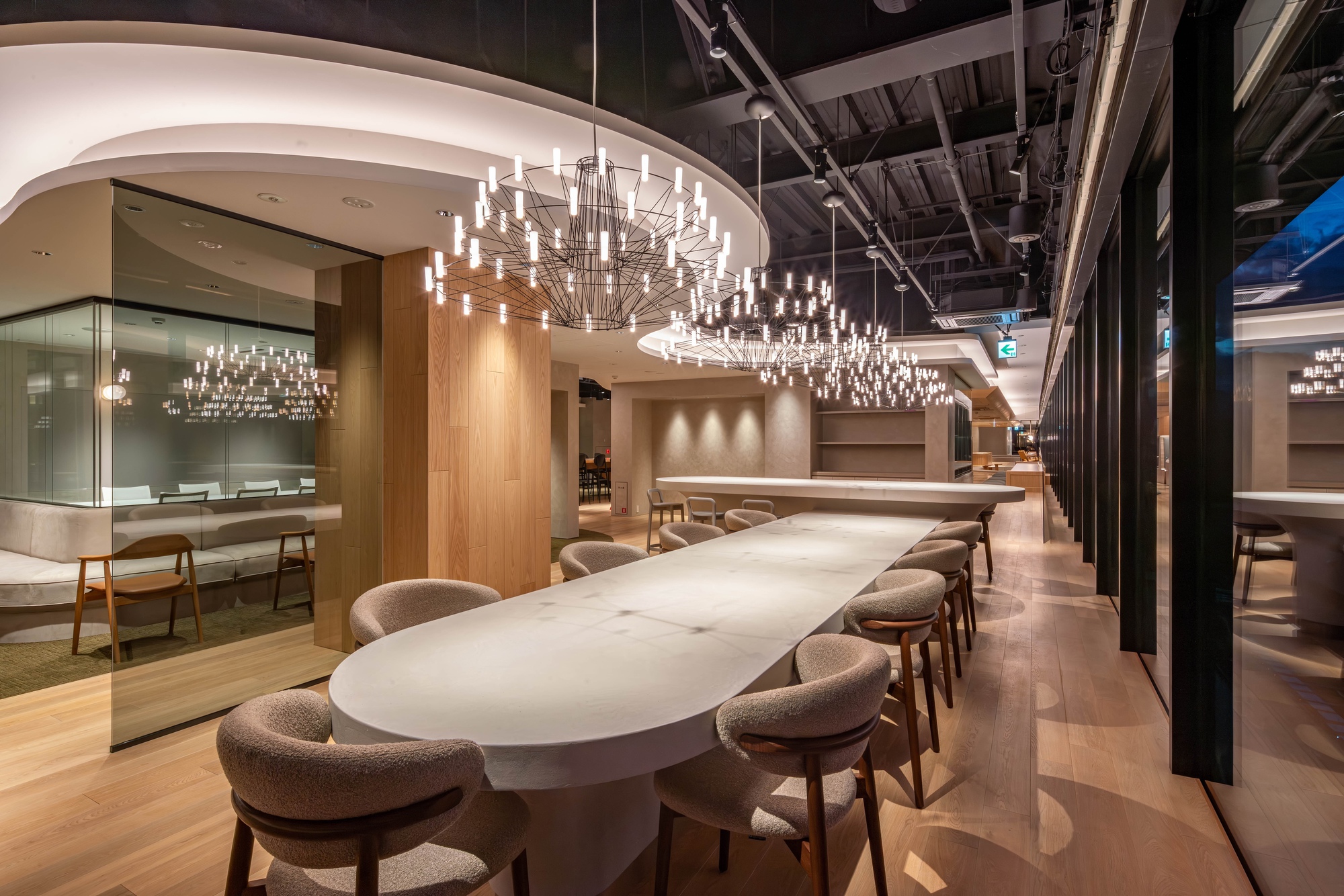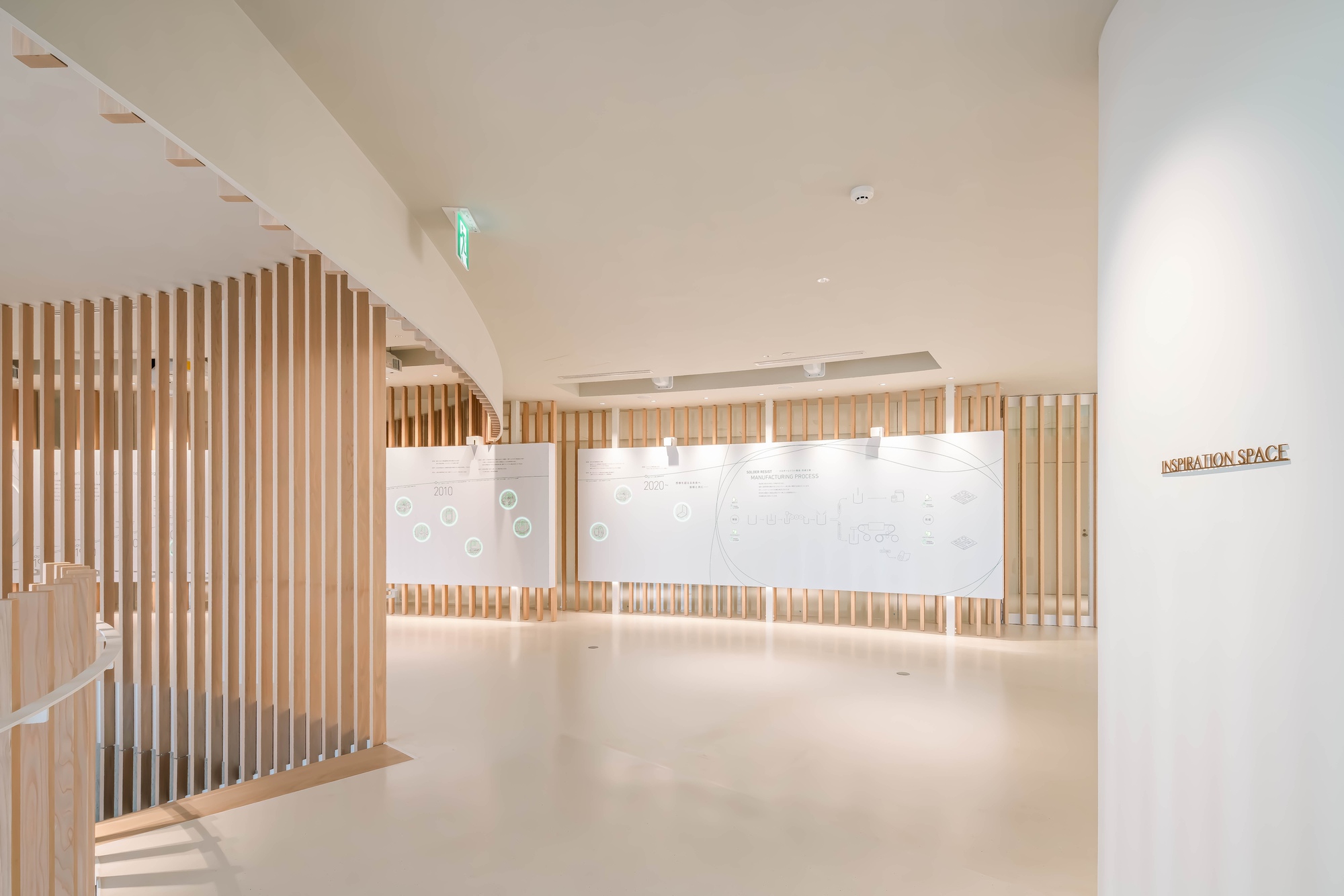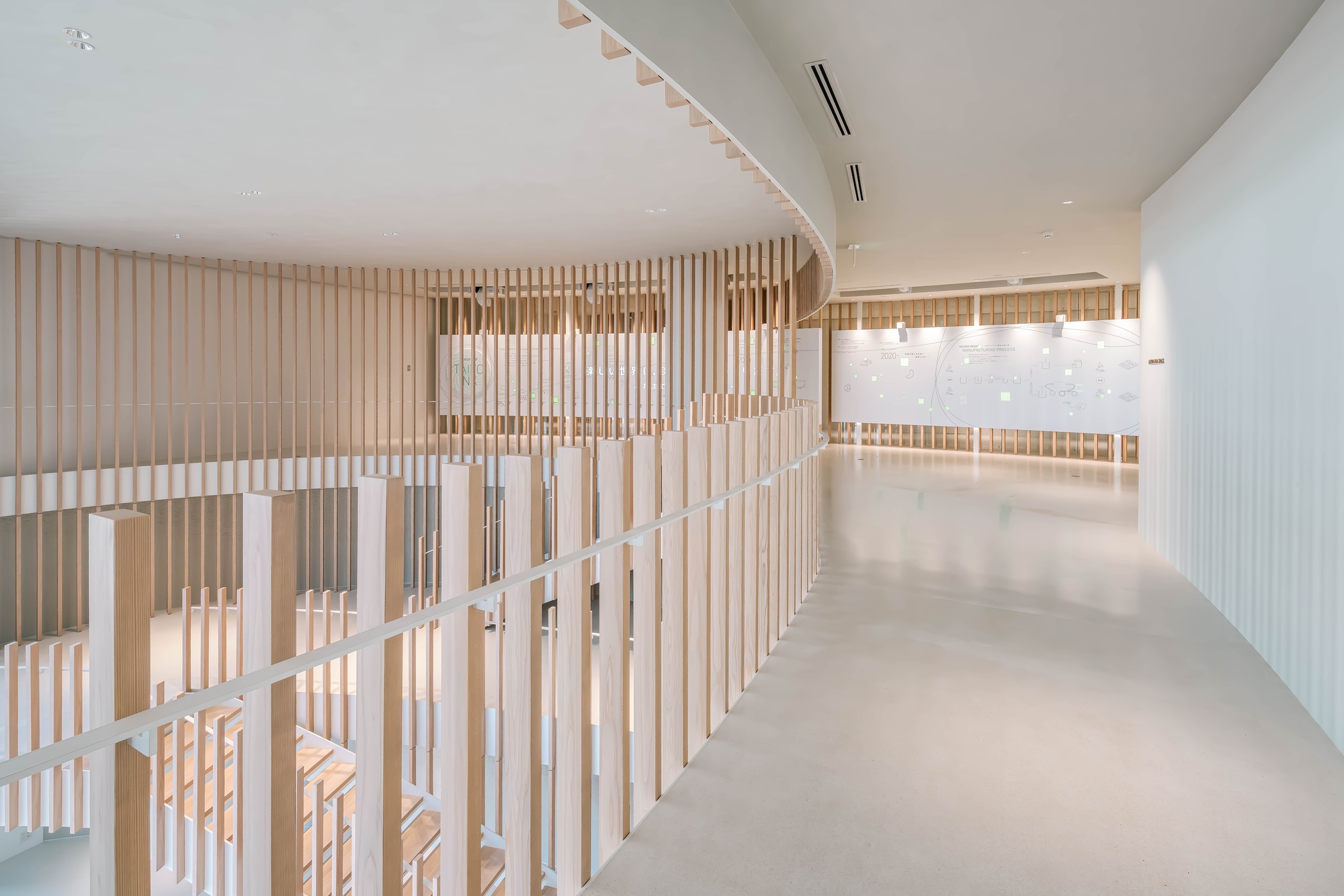 Creativity and inspiration of individual workers are stimulated by unknowingly moving between different environments created by the lower floors and upper floors, well-lit spaces and shaded spaces, time- and space-dependent changes in external environmental conditions, and varied combinations of materials. It is hoped that opportunities for unexpected encounters incorporated in the space stimulate communication between individuals and organizations and induce serendipity to give rise to unprecedented innovations.
