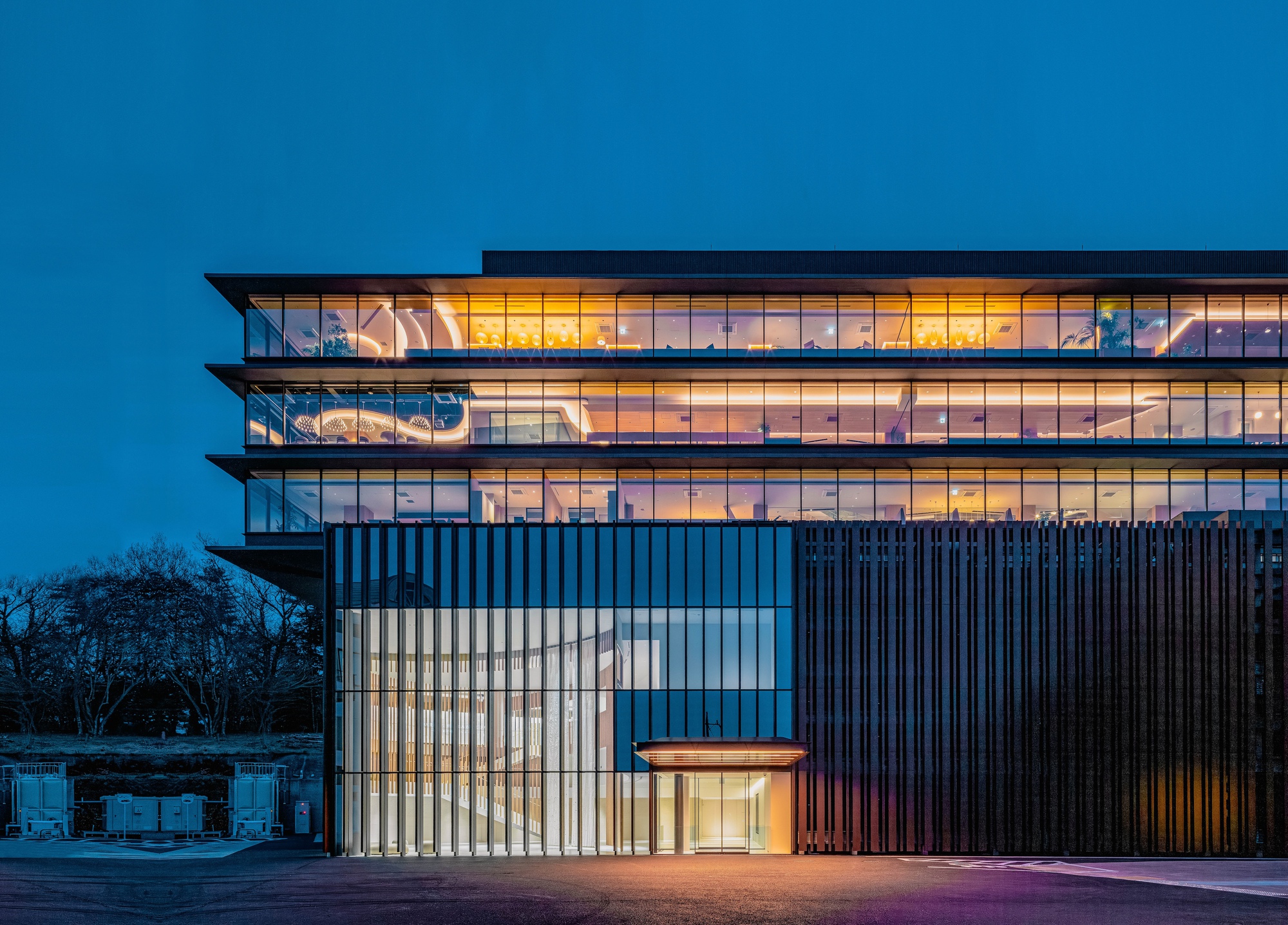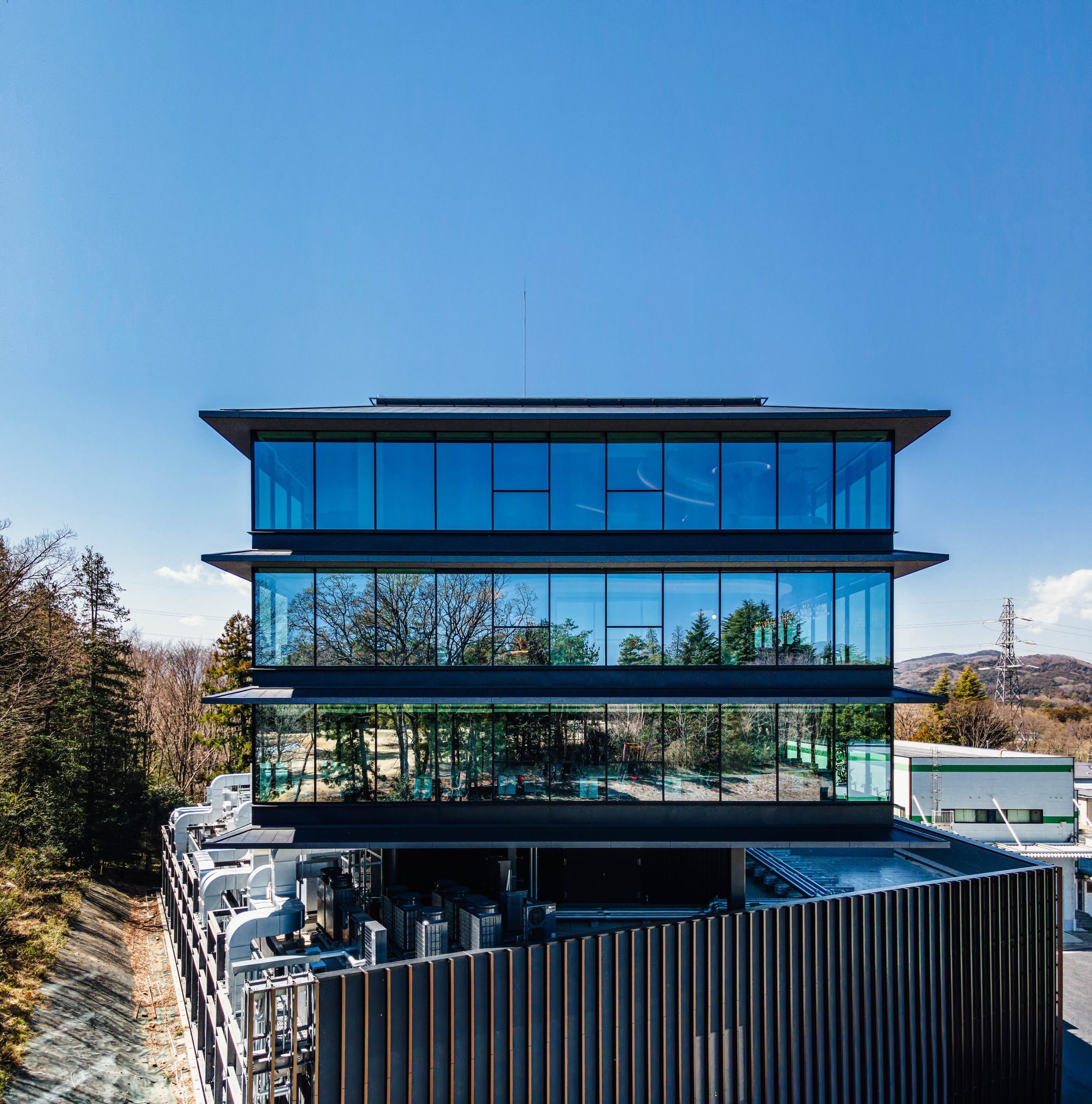 The exterior of the lower floor zone is finished with earth-colored louvers to blend harmoniously with the surrounding lush greenery. The upper-floor office zone is enclosed by glass and horizontal eaves to create a striking contrast to the lower-floor design. The simplicity of the vertical and horizontal elements stresses the presence of a voluminous structure that looks like floating over the forest.