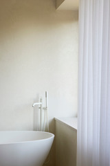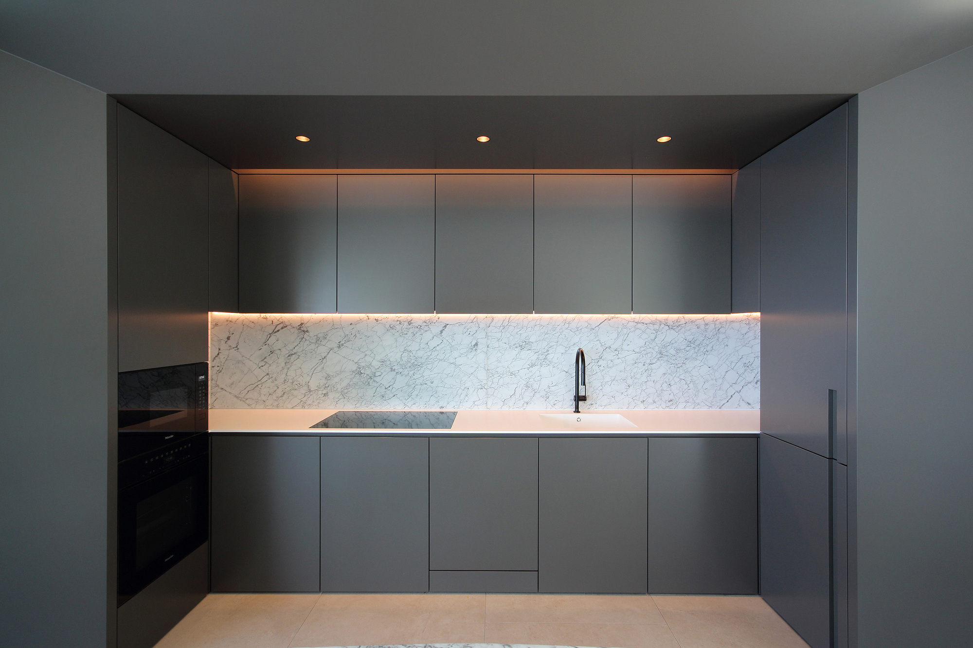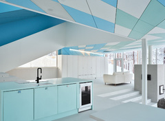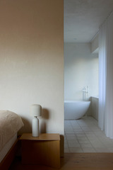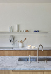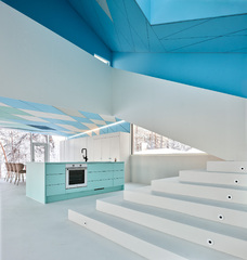 The interiors include fully custom-made fixed furniture, like the oak "boiserie" that covers the walls, the marble vanities in the bathroom or the open kitchen that integrates various technical equipment into its structures. The furniture floats in the rooms to intensify light and contemporary appearance of the interior. Privacy is managed through the use of retractable roller blinds which, perfectly integrated on the perimeter of the internal ceiling, could filter the view from the outside.