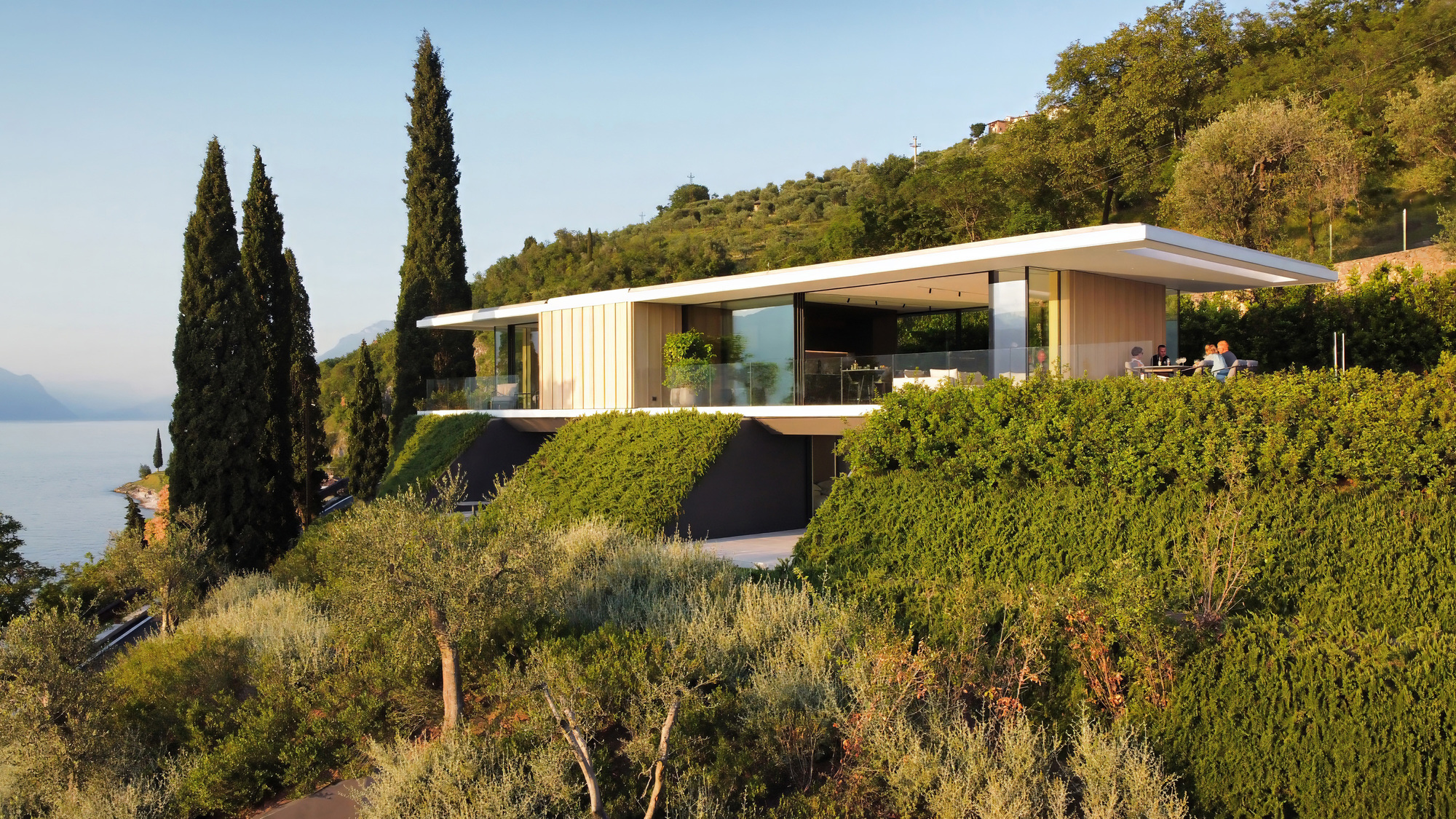 The garden is designed with lines that follow the levels of the land, and the vegetation depends on the orography of the site: the lawn on the flat terraces, specific essences for the most significant slopes. Native Olive trees and tall pre-existing cypresses have been preserved and enhanced in the composition of the project: the vegetation is as important as the architecture for the customer's comfort.