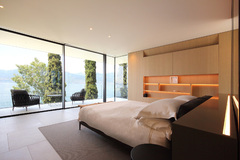 The elevations of the main floor are largely glazed: all the rooms have a wide view of the lake and the pavilion becomes a light and permeable object. The flat roof has a cantilever on all 4 sides and the volume slightly exceeds 3 meters in height: in this way there is the perfect balance between light and shadow and the house is completely integrated into surrounding vegetation. The roof surface has been thought with the same care as an elevation: the technical components have been hidden and the surface has been covered in light gray ceramic material.