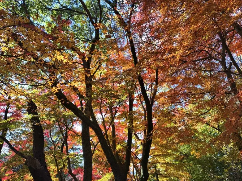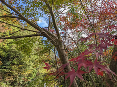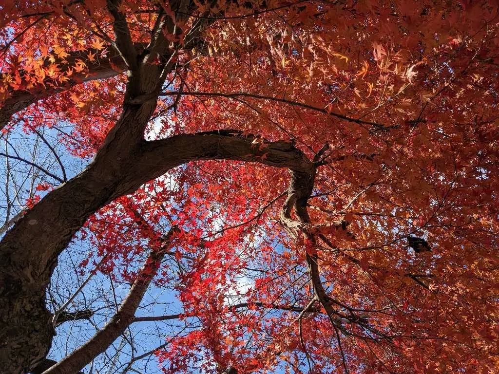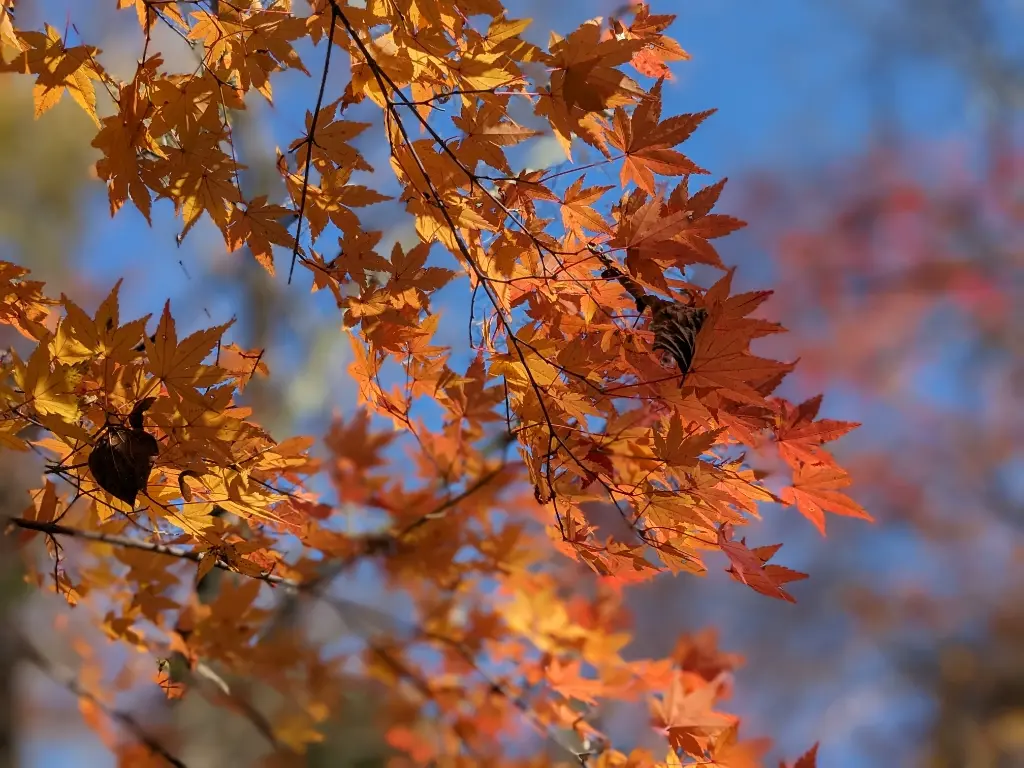 ご近所の紅葉具合を見てきた。ところどころ赤いのもあるけどまだあんまり、という感じ。風が強く冷たいせいかいつもより歩くの疲れた #今日の青空 #autumnstr