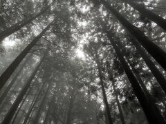 I was walking along a forest road in the fog. The weather was bad, so I had given up on taking photos. But when it started to brighten a little, I looked up and saw a beautiful scene. This is the photo I took at that moment.